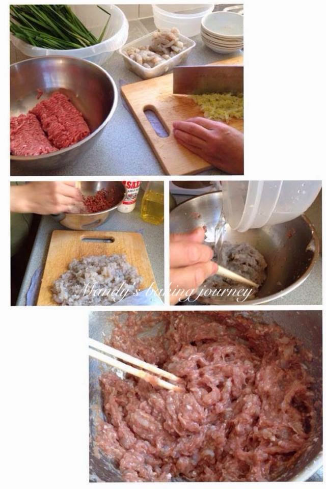 Use half a cup of water and add into the mince pork to loosen the meat and stirring vigorously until it is all combine and the meat is sticky in texture. Do the same with the minced prawns and the add it to the mince pork.
