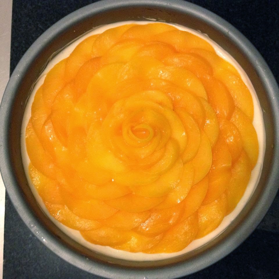 Line the thin slices of peaches around the top starting from the outside working your way inwards.